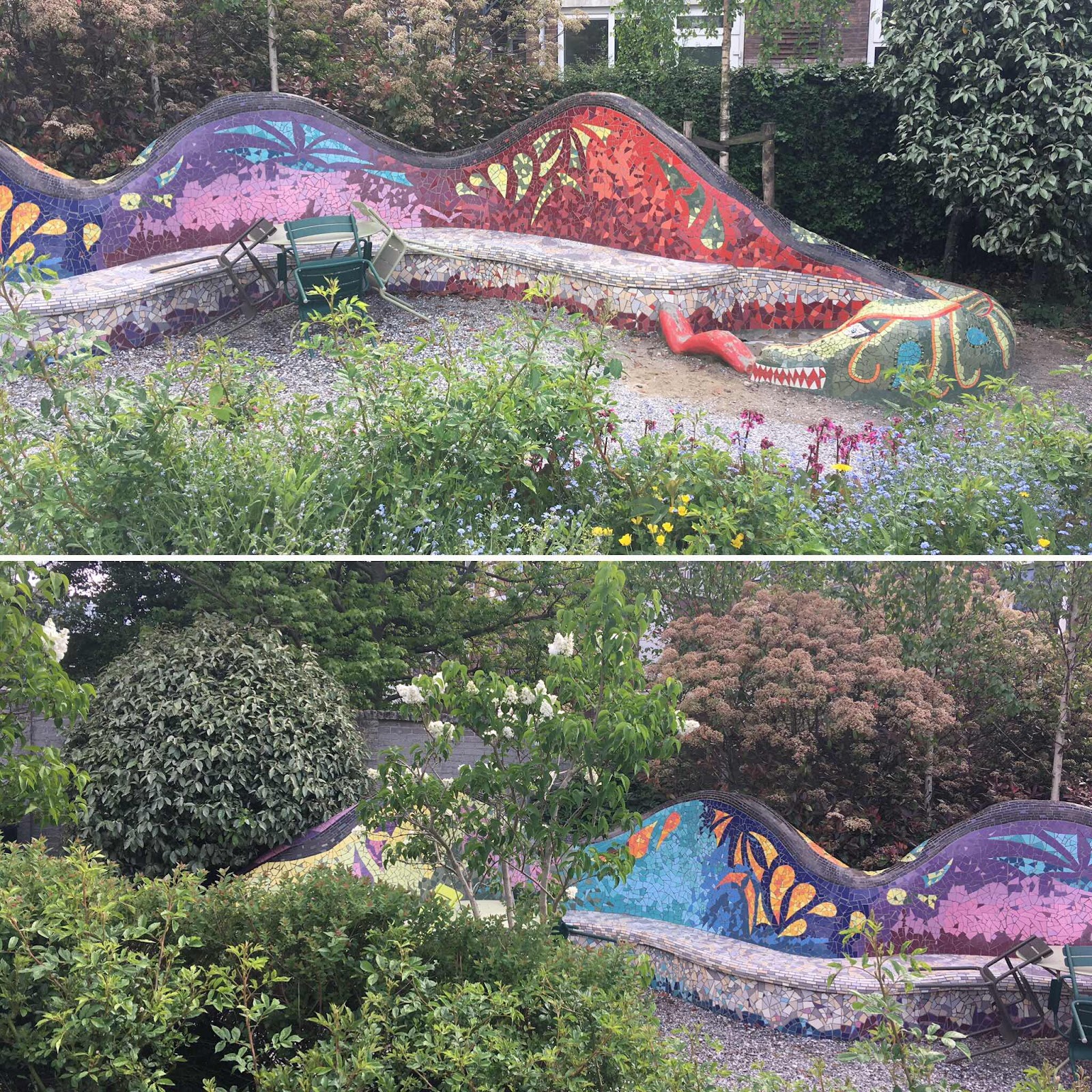 When I took the same walk Tuesday morning (by now a day has passed since I began this entry, and it is Wednesday) I discovered things I had missed in the dark. Photo 1 is an artwork that charmed me because of how it plays with the fact that it is partly concealed by trees.