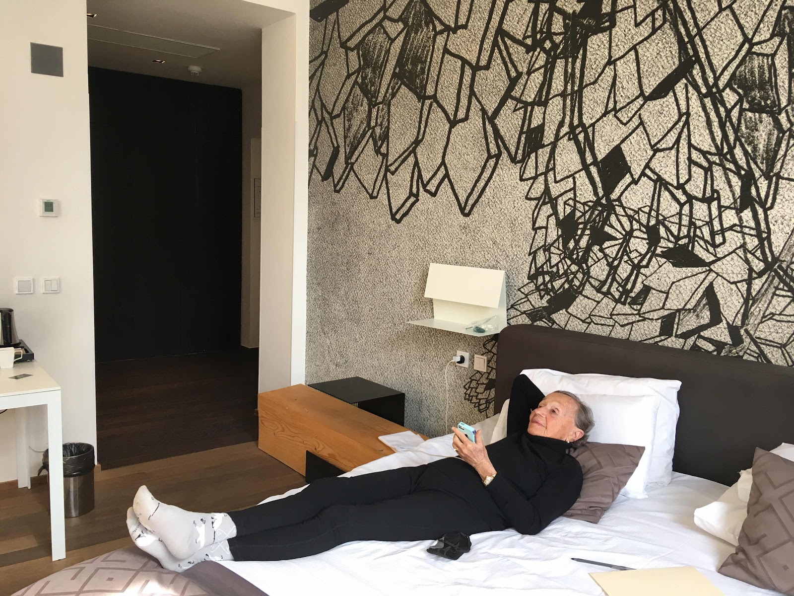 But first - I wanted to take a photo of Chris dancing her lecture but of course motion is hard to capture in a still photo. So instead I include this photo of her lying on our hotel bed just before the lecture. Until this photo, I disliked the mural behind the bed. It had a feeling of chaos and collision that troubled me. But in this photo it feels more like art that can embrace chaos and difficulty. So here is Chris in the middle of a world filled with such complexities, relaxing before her lecture.