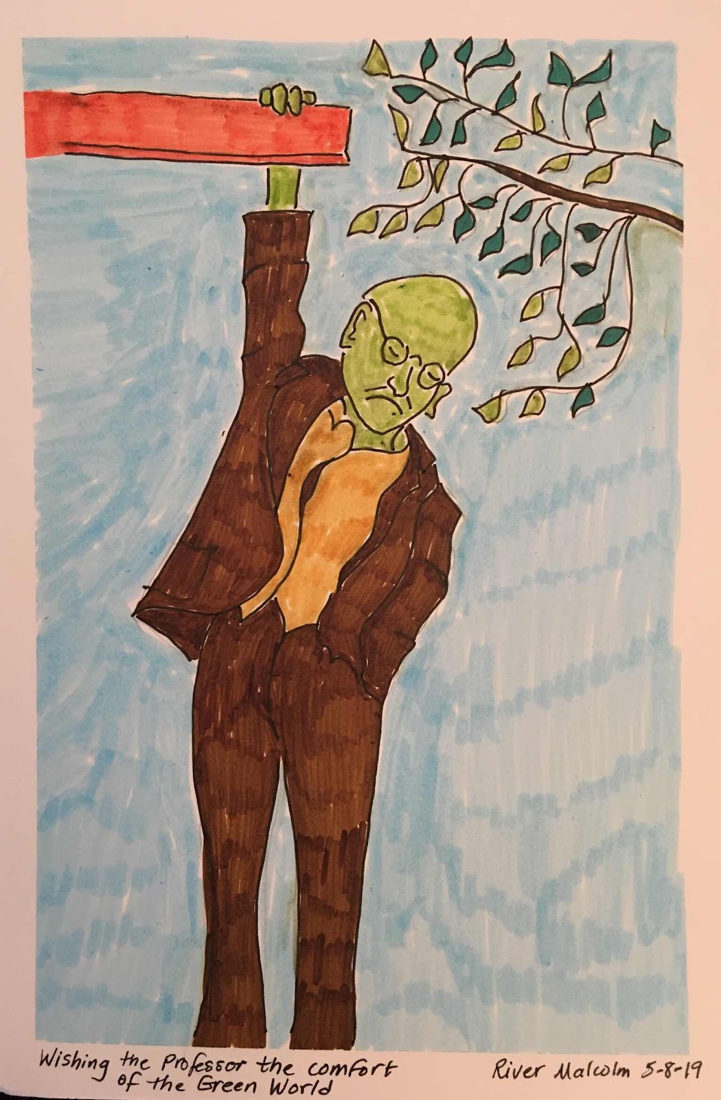 Another thing that exhausted me was our drawing session. I tried to draw a version of the hanging Freud sculpture and when I chose to color the skin green it stirred up enormous unexpected sadness. Freud looked so alone dangling there at the top of a city building. I felt the need to draw some green branches reaching out to him so he would be comforted not be so all alone. I found lyrics from Mary Magdalene’s song in Jesus Christ Superstar coming into my mind, words like “I don’t know how to love him” and “He’s just a man.”