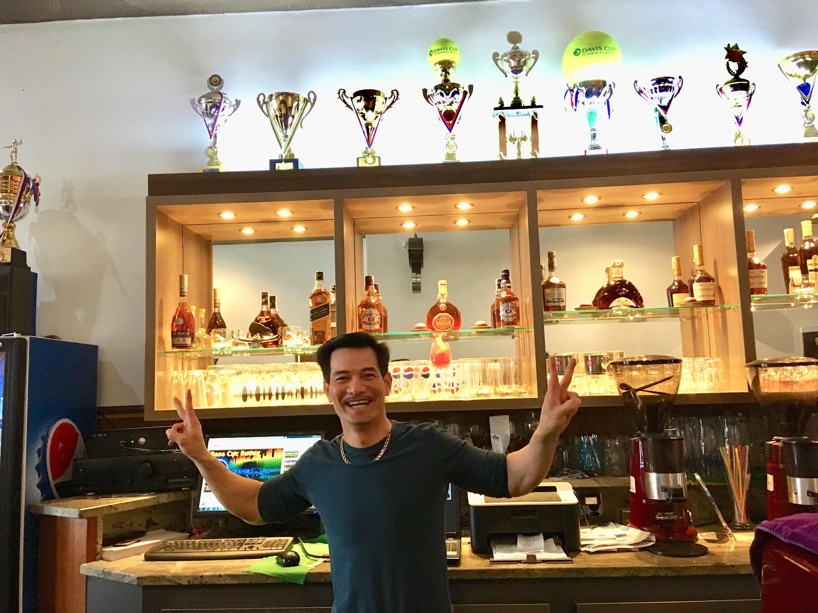 Etc. When I asked him to pose in front of his trophies and he held up two fingers of each hand to form the “V” for victory, our whole group applauded him. (Photo 5). The woman who had been at the counter and brought us water (who also spoke little or no English, and who as we learned later actually worked at the bakery a few buildings away and had come to help him out) smiled and said “Chanpion.”