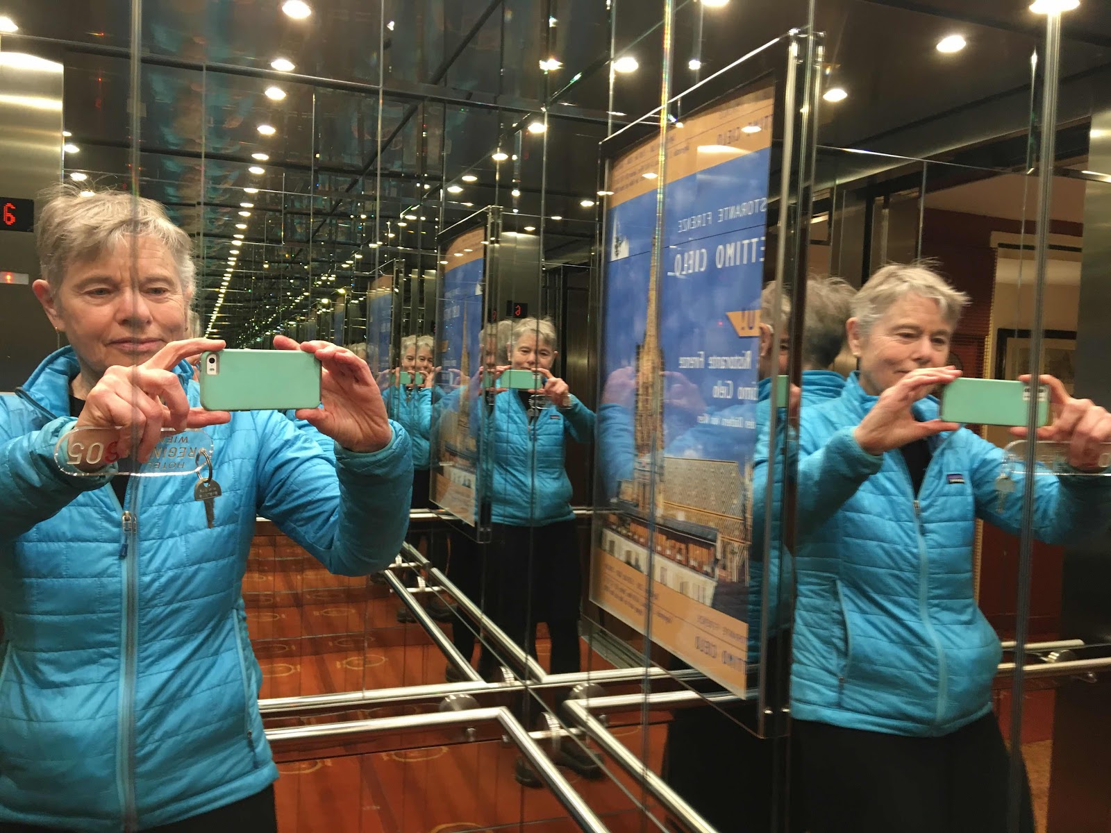There is so much more I would like to write but it is now nearly 4am and tomorrow, my friend, we will be following the trail of Freud’s life in Vienna, walking streets he walked and visiting places he lived and visited. I am very grateful for the specialtime for  reflection  that this blog ( and your companionship in imagination) make possible but I am also finding this trip emotionally and intellectually challenging and exhausting. I will end with two photos. I left dinner early last night, skipping dessert, so grateful to make the short walk back to our hotel alone. The church (Saint Stephan) was beautifully lit up (photo 12). Then in the elevator I noticed the mirrors - like in a department store dressing room or in the Freud museum and the infinite reflections of self. It made me think of Chris talking about the word for theory coming from a Greek word for seeing and how the theories of all these men - Jung, Buber, Freud provides different ways of seeing life and herself and relationships. I also thought that the mirrors multiplied and reflected my utter exhaustion. This poor aging brain of mine just can’t take in and digest all the rich food for thought I am offered on this tour.