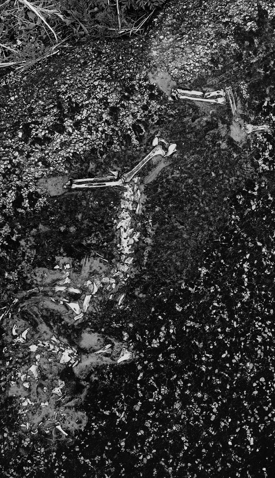 On a walk Saturday morning I came across the dead body of a raccoon and photographed it. Later I saw some remnants of bone embedded in the tarmac of the road. Both intrigued me because they were visual representations of something that had once been alive but was gone, but still parts of it lingered. (Photos 4 and 5).