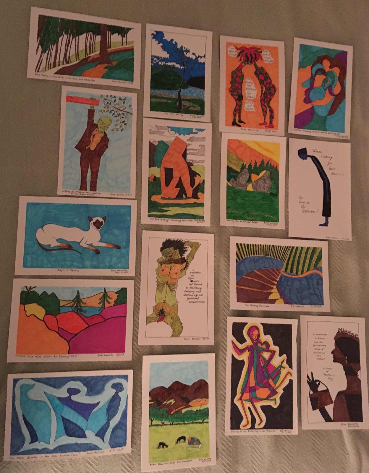 In the meantime, I think I will conclude, here in the air between Chicago O’Hare (where I flew to from Des Moines) and Seattle, with photos 10 and 11. Judy and I were too tired our last night in London to draw, or to spread out our drawings from the whole trip together and look at them. So we spread them out separately and here they are. See you on the trail (someday, somewhere) and thank you with all my heart for walking with me.